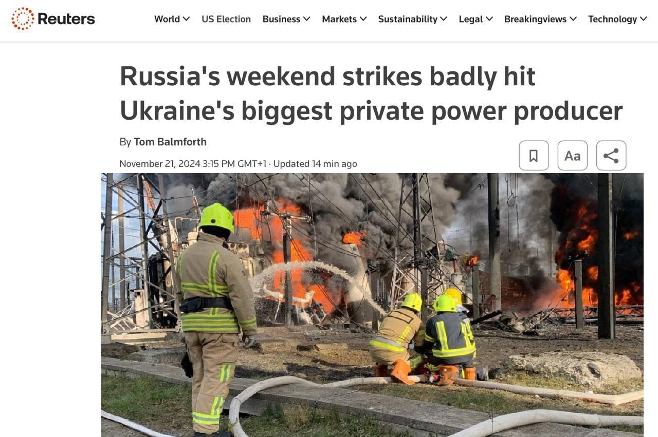 Нагадаємо, що у неділю, 17 листопада, у пресслужбі ДТЕК повідомили, що російська армія обстріляла теплоелектростанції ДТЕК. Обладнання станцій серйозно пошкоджене.