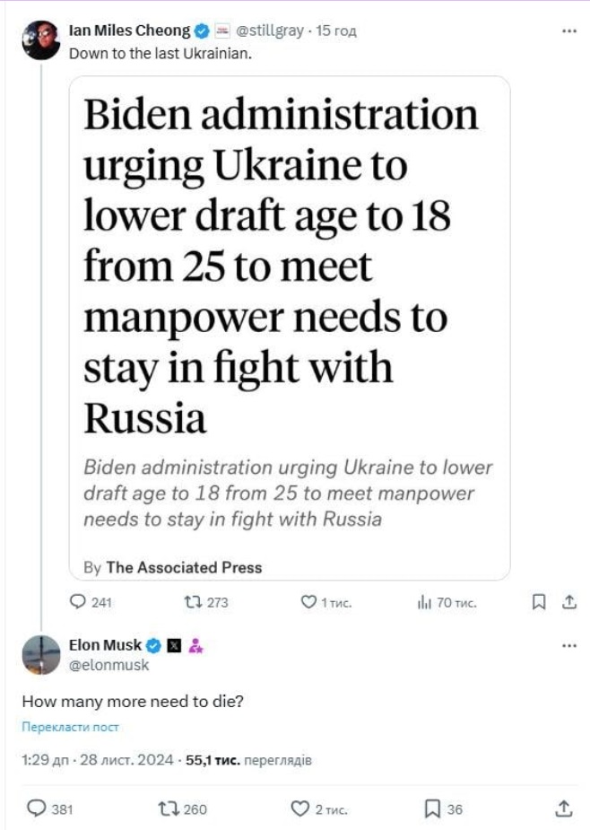 Підприємець, якого новообраний президент Дональд Трамп номінував на посаду керівника Департаменту ефективності державного управління, прокоментував у мікроблозі X новину про те, що Білий дім вимагає від України призвати 18-річних юнаків на війну: