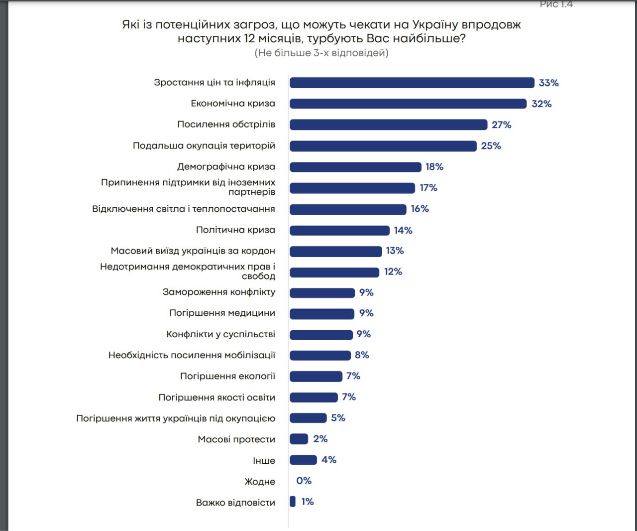 Він звернув увагу на результати опитування соціологічної групи "Рейтинг" щодо того, що найбільше лякає українців у 2025 році. Результати опитування показали, що українців найбільше турбують зростання цін та економічна криза. Ці проблеми випередили страх посилення обстрілів та подальшої окупації українських територій. Воєнні ризики турбують чверть опитаних.