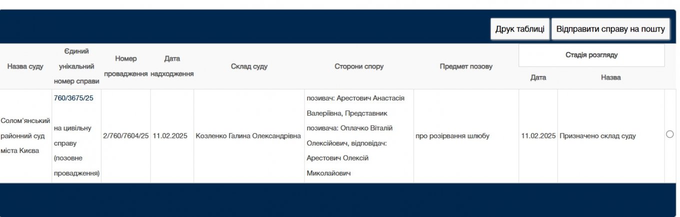 За даними з судового реєстру, на розлучення подала саме Анастасія. 11 лютого Солом'янський суд Києва прийняв її заяву на розгляд, однак коли відбудеться засідання - невідомо.
