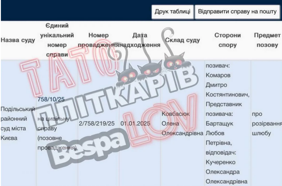 І поки ні Дмитро, ні Олександра офіційно не коментують цю тему, оглядач українського шоу-бізнесу та блогер Богдан Беспалов опублікував інформацію з судового реєстру, в якому є позов про розірвання шлюбу пари. За його словами, скріни документів знайшли підписники.