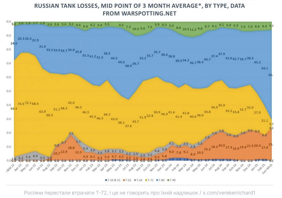 Верекер звернув увагу, що за останні місяці втрати Т-72 почали стрімко знижуватися і до березня впали практично до нуля. Наразі дві третини російських втрат у танках припадають на Т-80, який перестали серійно випускати в 1996 році. Ще чверть втрат припадає на Т-62, які виробляли до 1975 року. І лише на третьому місці за кількістю втрат йде найновіший з використовуваних у боях танк Т-90.