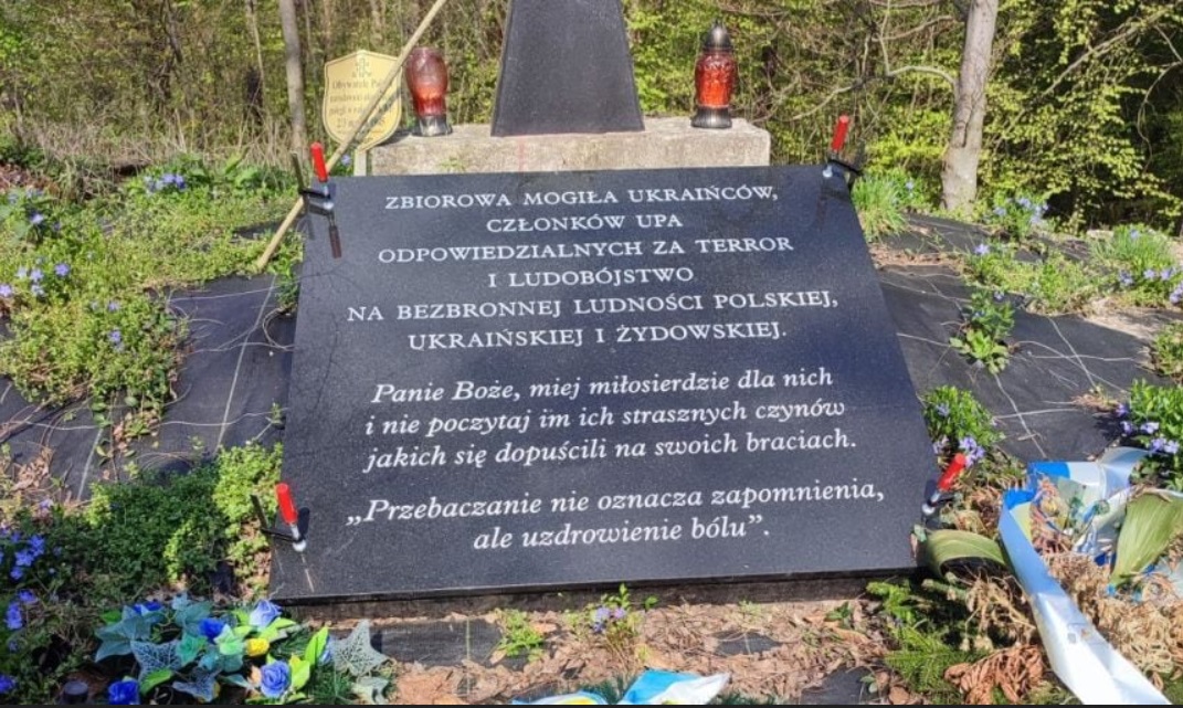 «Братська могила українців, учасників УПА, відповідальних за терор і геноцид проти беззахисного польського, українського та єврейського населення. Господи Боже, помилуй їх і не зарахуй їм за ті жахливі вчинки, які вони вчинили проти своїх братів. Пробачити не означає забути, а зцілити біль», – зазначено на табличці.