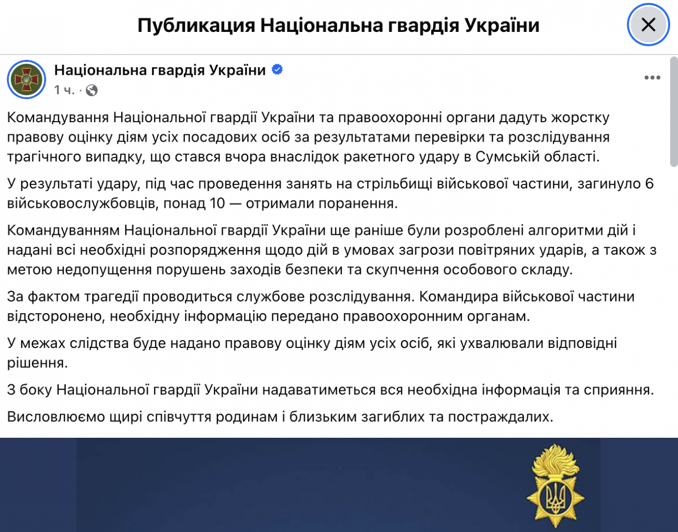 НГУ обіцяє надати всю необхідну інформацію та сприяння слідству.