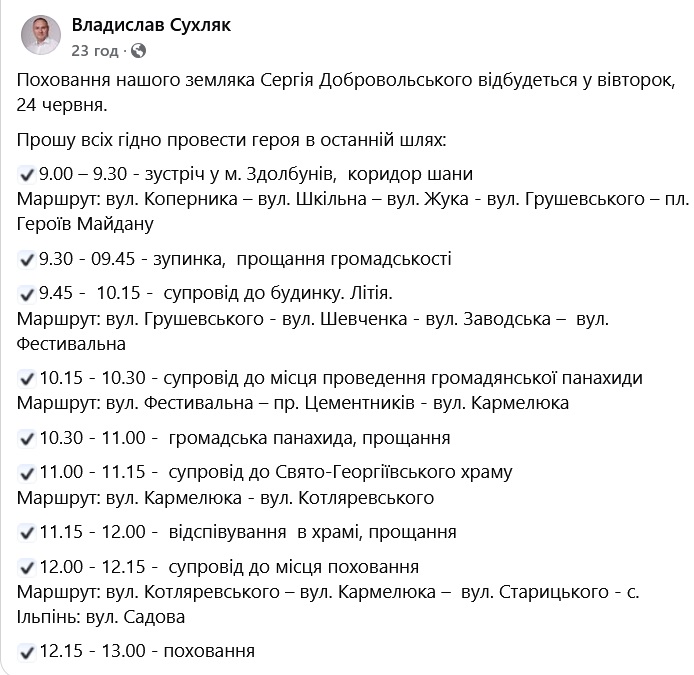 Поховання Сергія Добровольського відбудеться у вівторок, 24 червня, з 12:15 до 13:00 у с. Ільпінь.