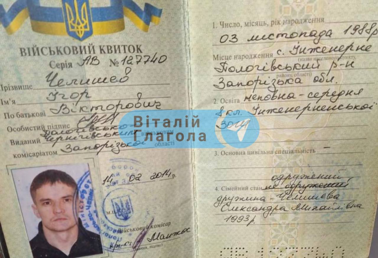 "Ексклюзивно мені вдалося отримати фото його військового квитка. Згідно з документом, це військовий Челишев Ігор Вікторович, 03 листопада 1988 року народження, уродженець села Чистопілля Пологівського району Запорізької області. Правоохоронці підкреслюють: мова про захоплення заручників не йде. Небезпеки для людей на місці події немає", - повідомив Глагола.