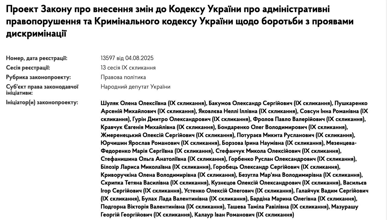 Група народних депутатів на чолі з головою партії «Слуга народу» Оленою Шуляк зареєструвала законопроєкт №13597 про внесення змін до Кодексу про адміністративні правопорушення та Кримінального кодекс щодо боротьби з проявами дискримінації.