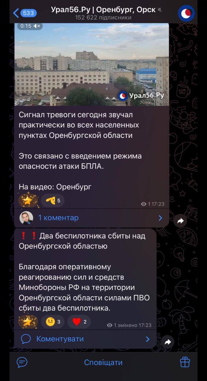 У телеграм-каналах пропагандистів з’явилось відео прольоту дронів над Оренбургом.