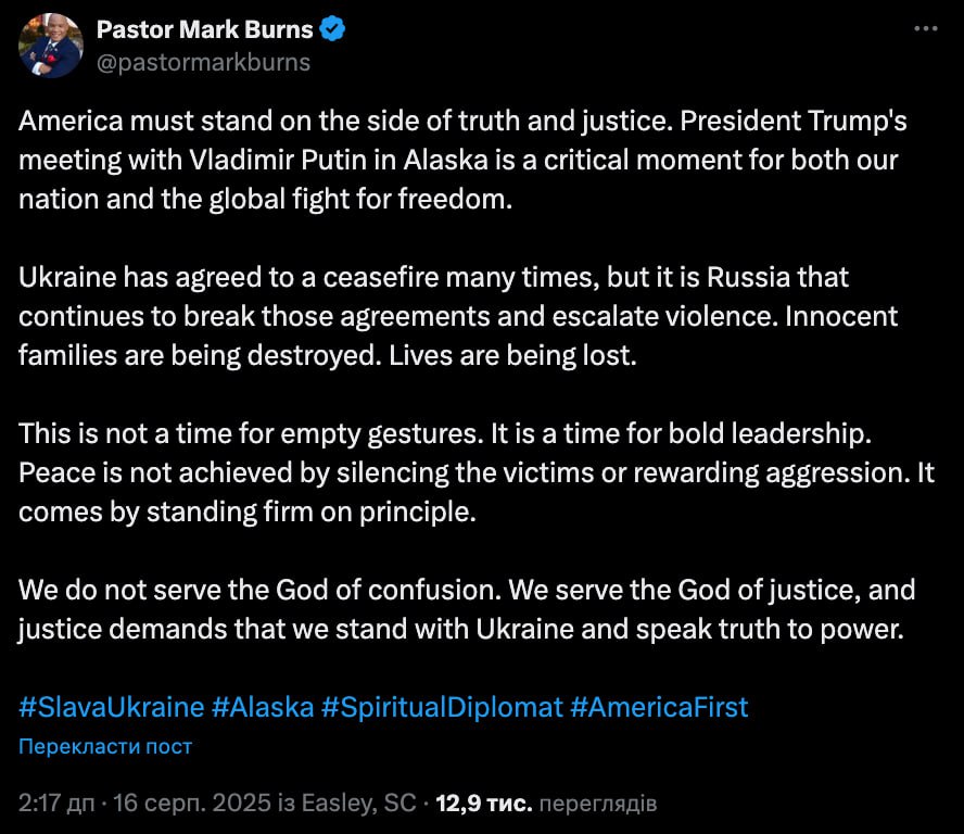 Духовний радник президента США Дональда Трампа Марк Бернс виступив із заявою щодо нещодавніх переговорів на Алясці. Він назвав зустріч із Володимиром Путіним «критичним моментом» і закликав Америку «стати на бік правди та справедливості».