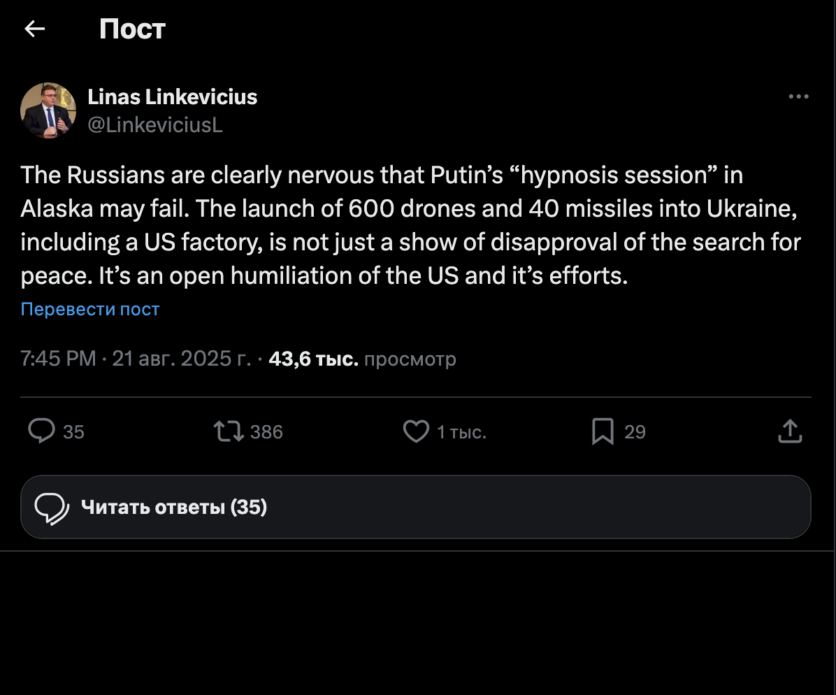 «Росіяни явно нервують, що «сеанс гіпнозу» Путіна на Алясці може провалитися. Запуск 600 безпілотників та 40 ракет по Україні, включаючи американський завод, — це не просто прояв несхвалення пошуку миру. Це відкрите приниження США та їхніх зусиль», – написав Лінкявічюс.