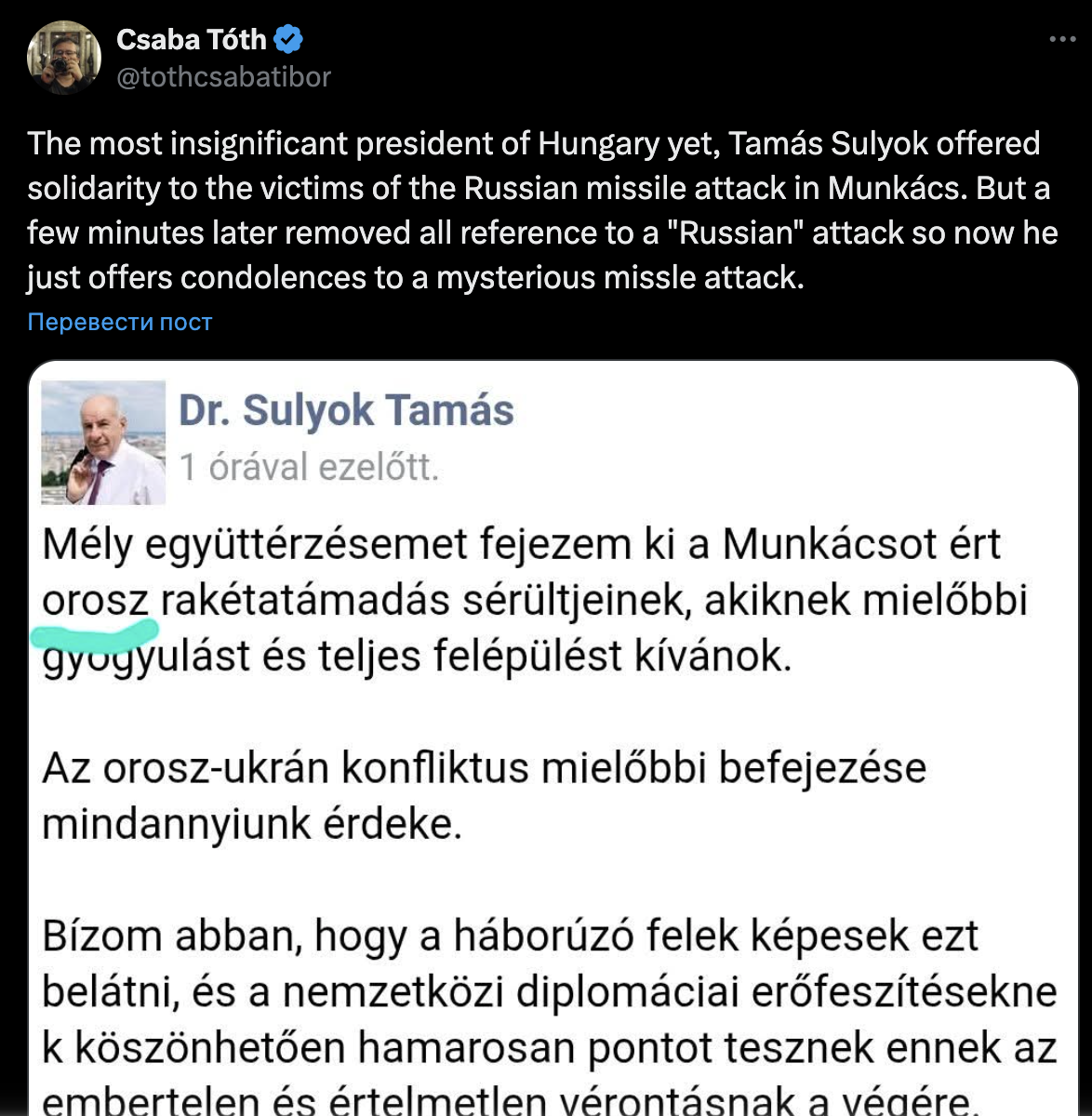Президент Угорщини Тамаш Шуйок опинився в центрі скандалу після того, як у своєму дописі у Facebook прибрав згадку про Росію, яка обстріляла українське місто Мукачево в ніч на 21 серпня. На це звернули увагу угорські видання Telex, 444.hu та місцева служба «Радіо Свобода».