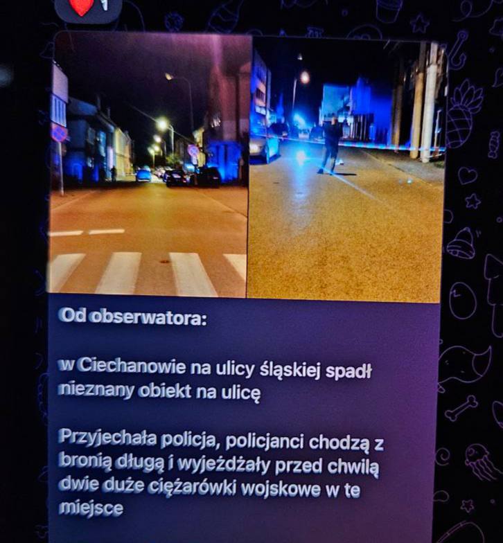 "В Цеханові, на вулиці Шльонській, невідомий предмет впав на вулицю. Прибула поліція, поліцейські озброєні. Дві великі військові вантажівки якраз вирушали до цього міста".