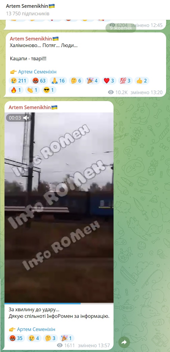 Раніше також стало відомо, що Росіяни влучили у поїзд з людьми на межі Сумщини та Чернігівщини (оновлено)