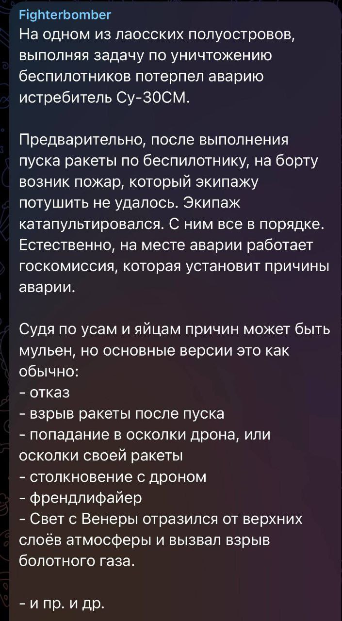 Telegram-канал Supernova+ зазначає, що йдеться про Су-30СМ і його екіпаж нібито катапультувався.