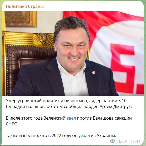 Помер у віці 64 років український політик та бізнесмен, голова партії 5.10 Геннадій Балашов. Про це повідомляє проросійське видання "Страна" із посиланням на нардепа-втікача Артема Дмитрука.