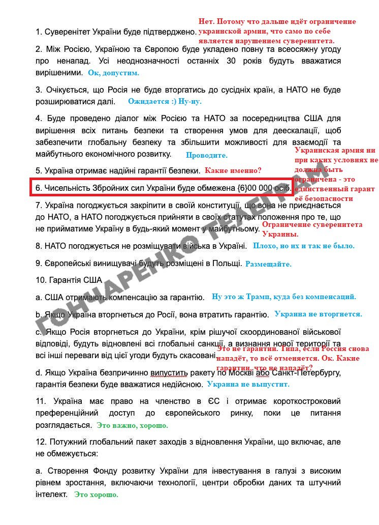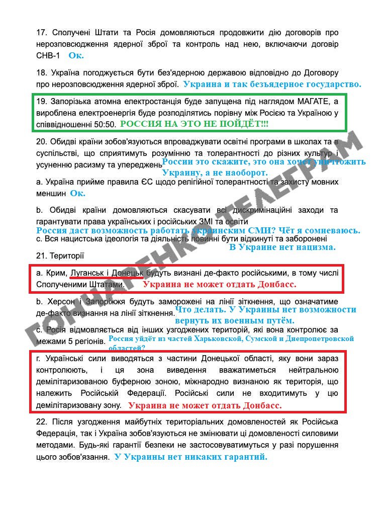 22. Після узгодження майбутніх територіальних домовленостей і РФ, і Україна зобов'язуються не змінювати ці домовленості силовим способом. Будь-які гарантії безпеки не застосовуватимуться в разі порушення цього зобов'язання.