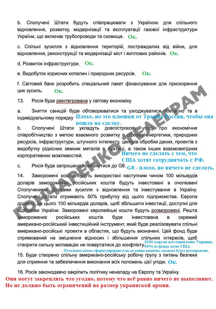 При цьому заморожені європейські кошти будуть розморожені. Інша частина заморожених російських коштів буде інвестована в окремий американо-російський інвестиційний інструмент, який буде реалізовувати спільні проєкти за певними напрямками. Цей фонд буде спрямований на зміцнення відносин і збільшення спільних інтересів, щоб створити сильну мотивацію не повертатися до конфлікту.
