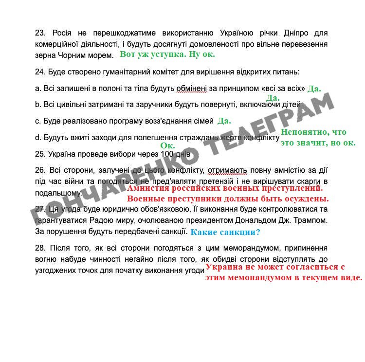 23. Росія не перешкоджатиме використанню Україною річки Дніпро для комерційної діяльності, і будуть досягнуті домовленості про вільне транспортування зерна Чорним морем.