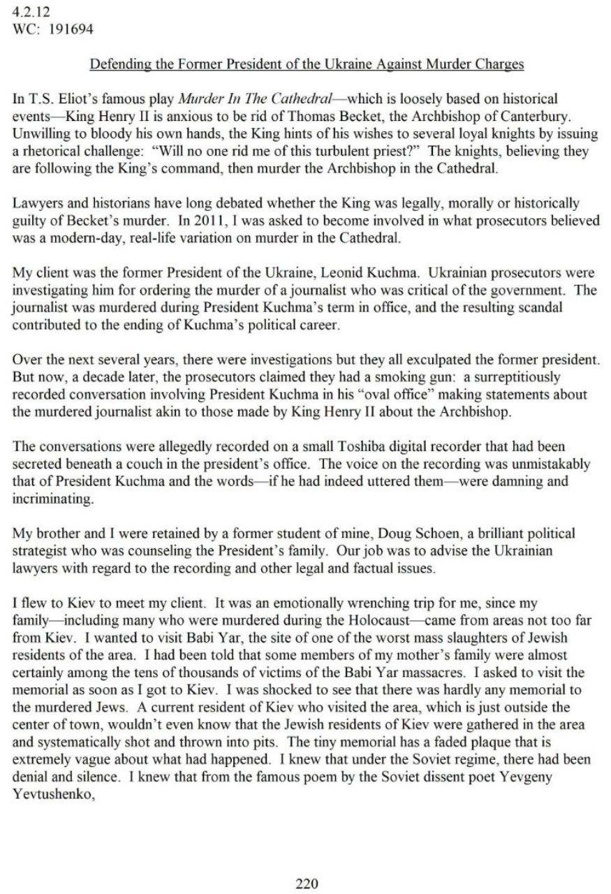 Ім’я другого президента згадується у стенограмі, де юрист розповідає, що консультував українських адвокатів у справі «плівок Мельниченка» і називає Кучму своїм клієнтом. За даними проєкту Epsfilesnexus, у 20 тисячах опублікованих документів Україна згадується 72 рази.