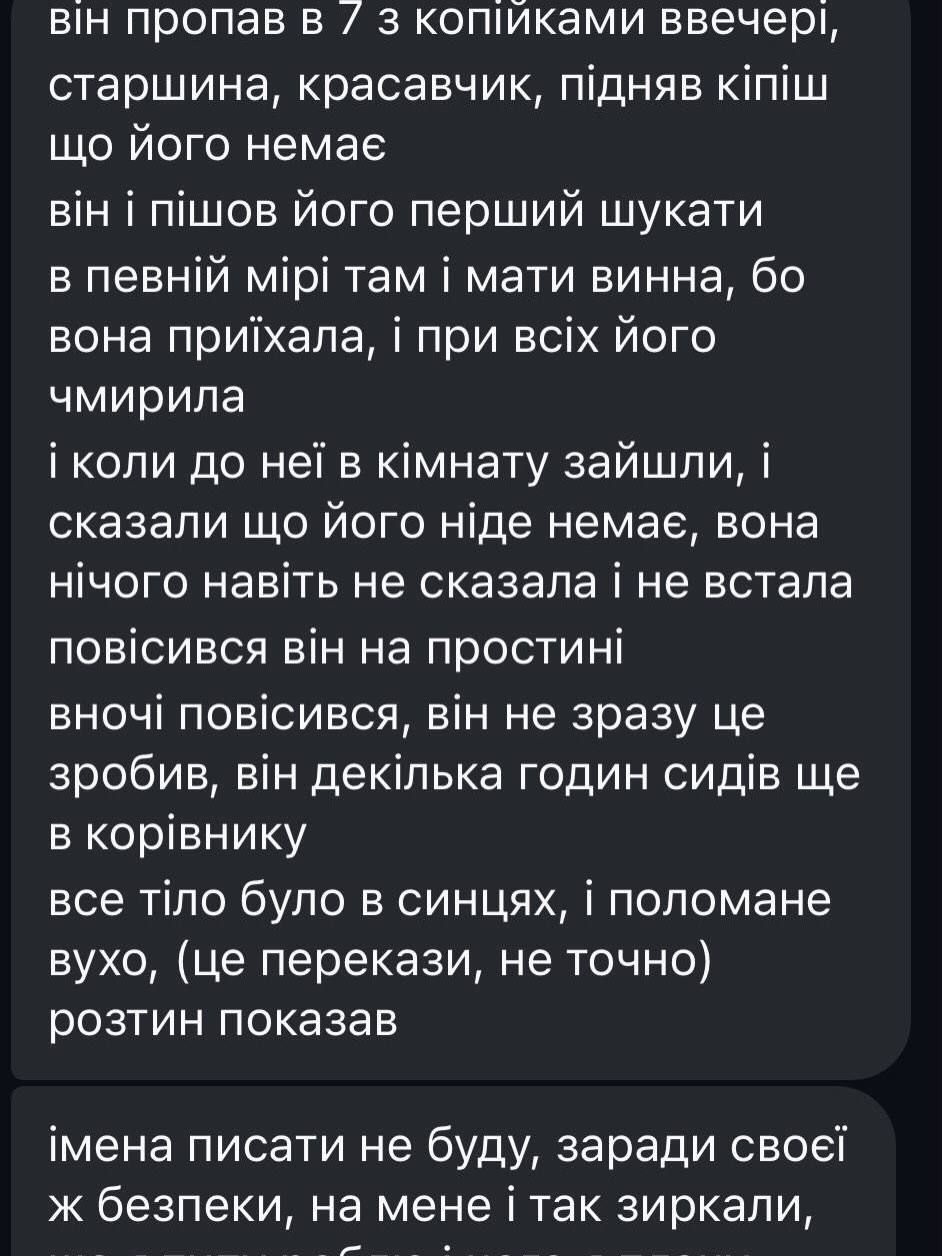 "Робили вони це за наказом відповідального офіцера на локації підполковника Косенка. Цих людей били, примушували їсти з брудної підлоги як тварин, пити олію, блювати та потім це їсти. В основному присутні до цієї справи займають сержантські посади, певні звання і ці люди складали присягу своєму народові? Один курсант не витримав такого ставлення до себе і пішов в СЗЧ близько 19:00. Помітили його відсутність тільки під час вечірньої перевірки. Він просидів в якомусь сараї за гуртожитком декілька годин і згодом зчинив самогубство повісившись на статутному простирадлі!", - розповідають подробиці у вже іншому пабліку.