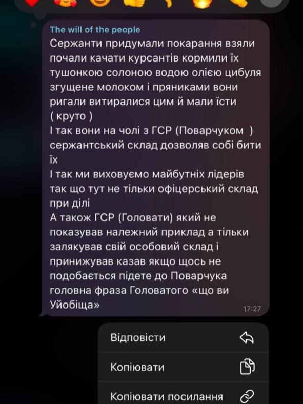 "Одного студента довели до петлі. Качають фізичними вправами, допоки бідний хлопчина не почав блювати, а потім змучили його це все зʼїсти. Я мовчати про таке не можу", - цитують жінку пабліки.