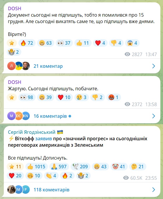 Як повідомлялося, вчора в Берліні Зеленський провів раунд переговорів з американською делегацією на чолі зі спецпредставником президента США Стівом Віткоффом та зятем Трампа Джаредом Кушнером. Було домовлено, що переговори стосовно мирного плану продовжаться сьогодні.
