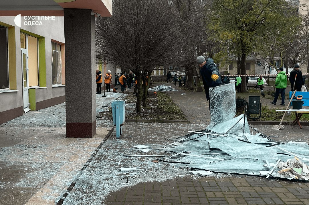 Відомо, що значних пошкоджень зазнав ліцей №1 у місті Південне. Постраждала вахтерка, яка була на зміні.