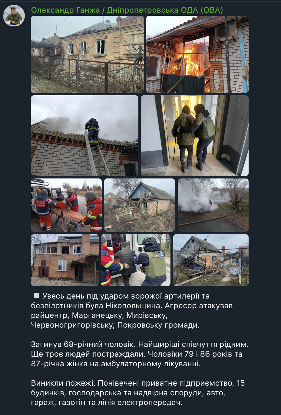 «У Нікопольському районі загинув 68-річний чоловік, поранені – чоловіки 79 і 86 років та 87-річна жінка – лікуватимуться амбулаторно», – повідомили у Дніпропетровській ОВА.