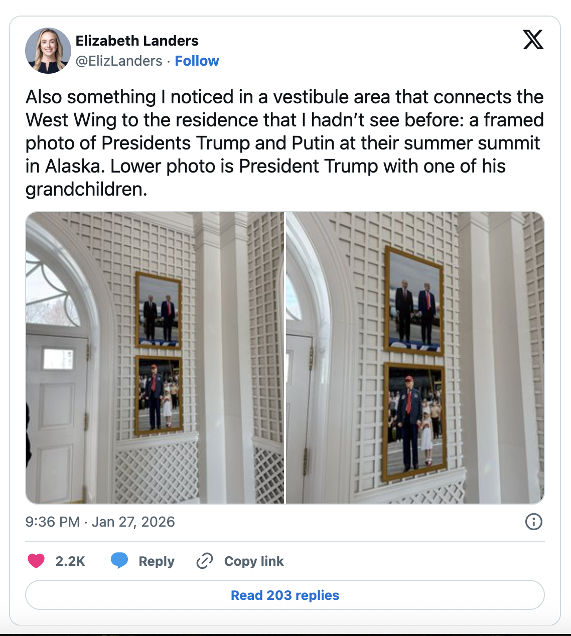 За даними журналістів, фото з російським лідером отримало помітніше місце, ніж інші знімки, зокрема сімейна фотографія Трампа з онукою Кароліною, зроблена під час його візиту на автоперегони Daytona 500 у лютому.