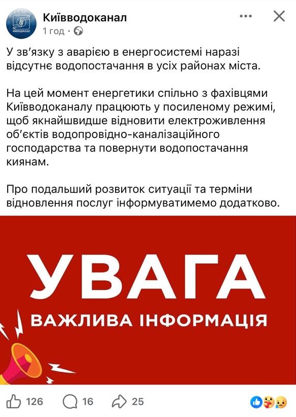 Через аварію в енергосистемі Київводоканал повідомив про повне припинення водопостачання у всіх районах Києва.