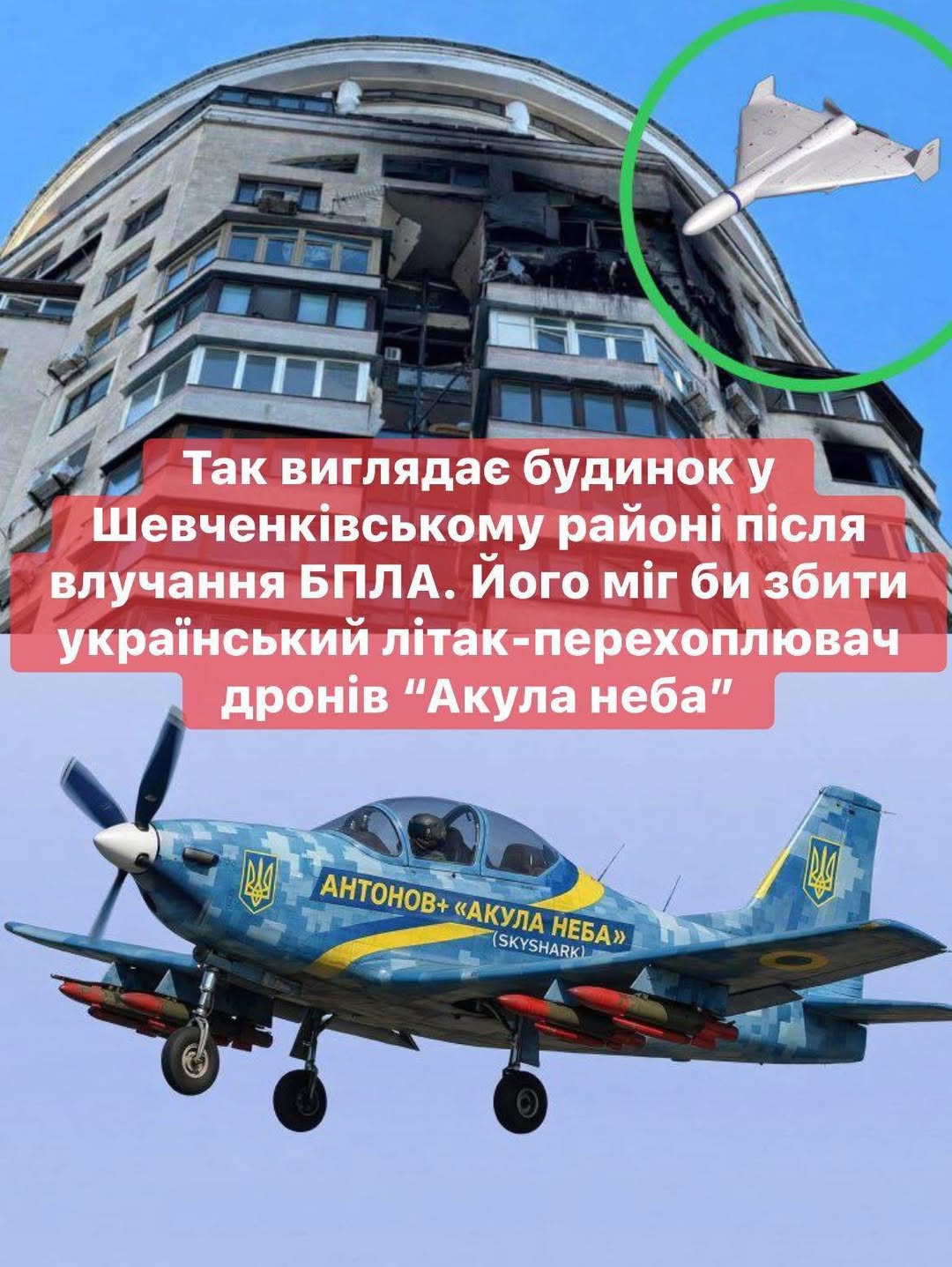 У Шевченківському районі Києва російський ударний безпілотник влучив у 22-поверховий житловий будинок на рівні 16–17 поверхів. Наслідки атаки вкотре актуалізували питання відсутності в серійному застосуванні українського літака-перехоплювача дронів Skyshark, відомого як «Акула неба», який міг би зменшити масштаби руйнувань під час масованих атак, про це повідомив Микола Катеринчук у дописі на Facebook.