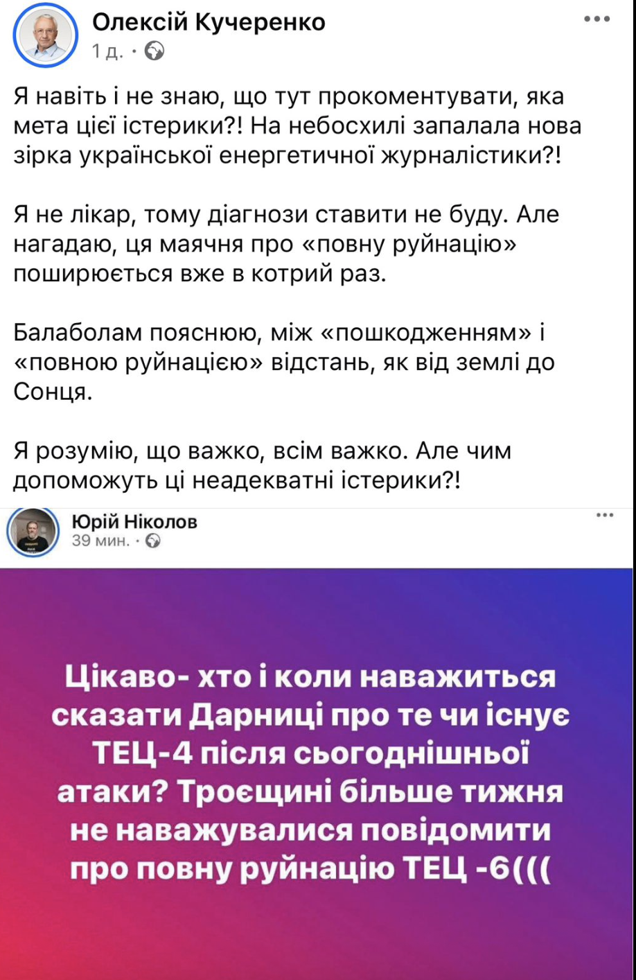 Після ракетної атаки РФ по енергетичній інфраструктурі Києва між журналістом-розслідувачем Юрієм Ніколовим та колишнім міністром енергетики, народним депутатом Олексієм Кучеренком виникла публічна суперечка щодо реального стану Дарницької ТЕЦ і перспектив відновлення теплопостачання на лівому березі столиці. Про це повідомляє FaceNews.ua з посиланням на допис Юрія Ніколова у Facebook.