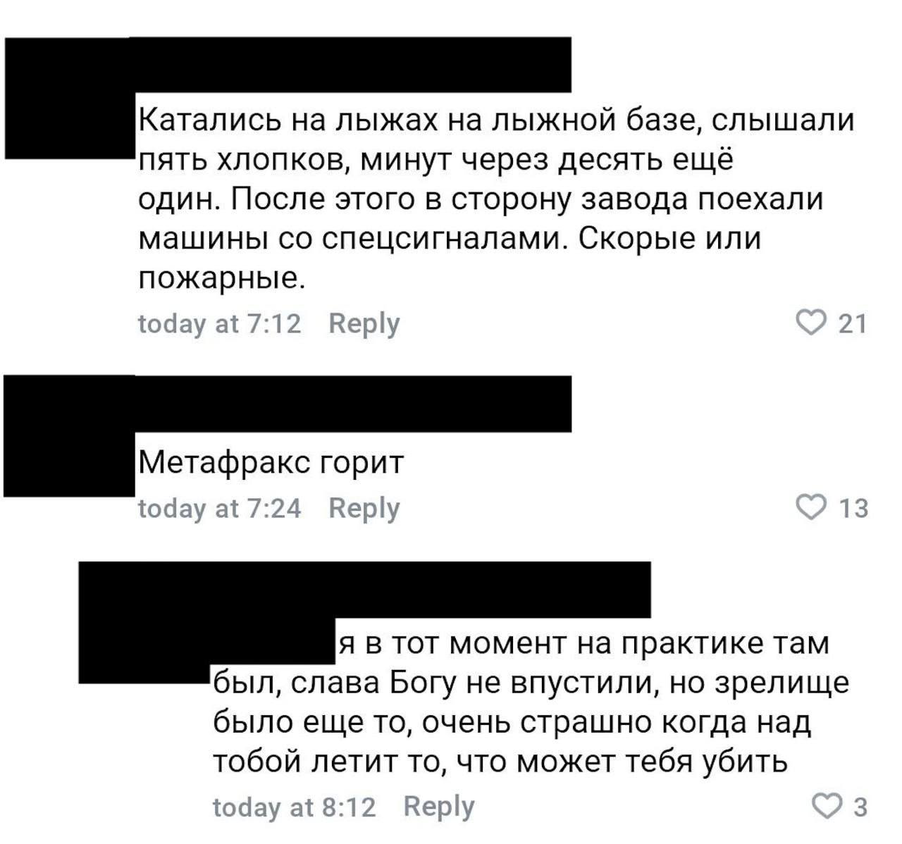 "Видовище було ще те. Дуже страшно, коли над тобою летить те, що може тебе вбити", - написав у соцмережах росіянин, який проходить виробничу практику нахімзаводі "Метафракс Кемікалс".