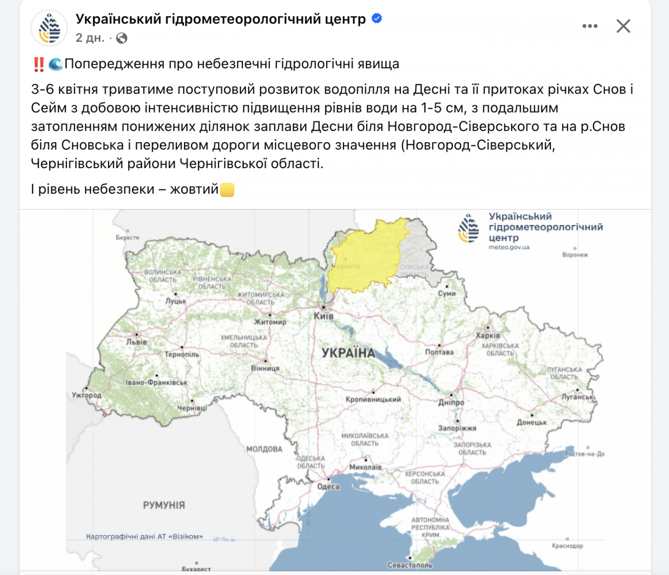 Український гідрометеорологічний центрУкраїнський гідрометеорологічний центр оприлюднив попередження про небезпечні гідрологічні явища у північних регіонах країни. У період з 3 по 6 квітня 2026 року на річці Десна та її притоках очікується подальший розвиток весняного водопілля, що може призвести до ускладнення транспортного сполучення та підтоплення територій.