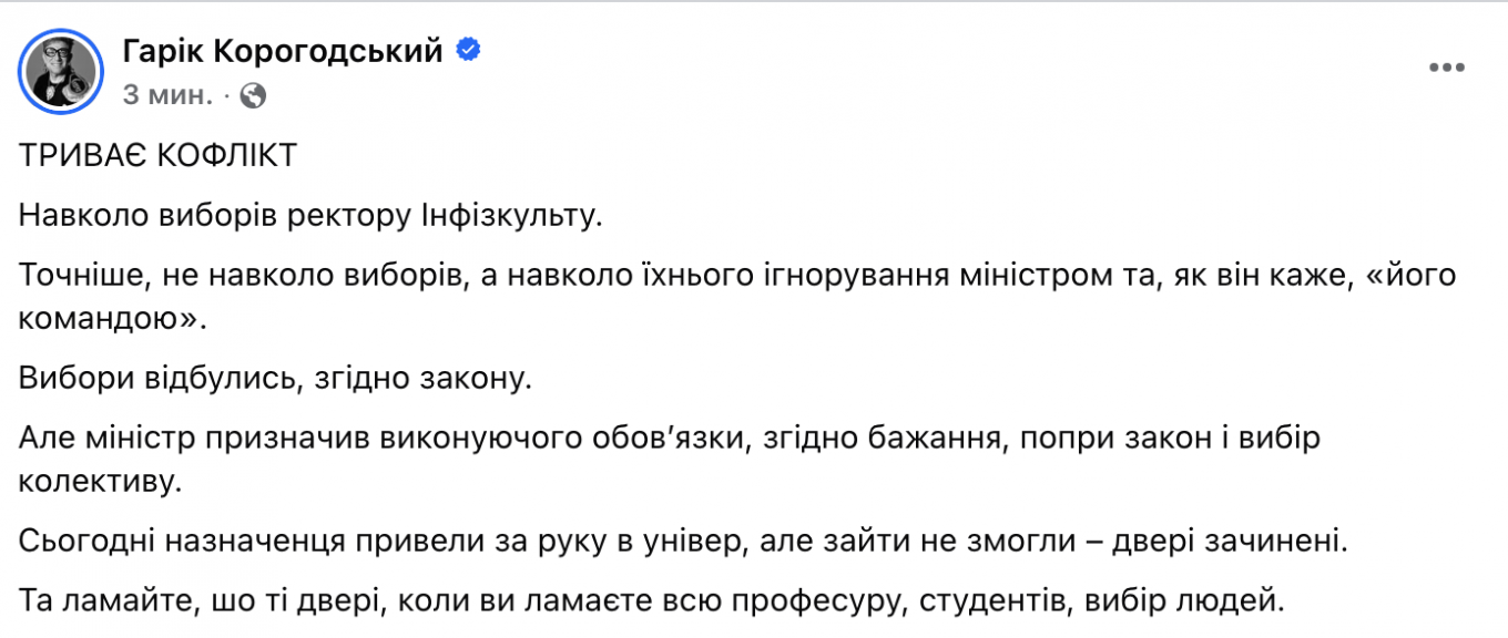 За словами Гаріка Корогодського, вибори ректора в «Інфізкульті» відбулися з дотриманням усіх норм чинного законодавства. Проте результати голосування трудового колективу не були враховані на рівні міністерства. Замість затвердження обраного кандидата, очільник відомства призначив «свою» людину на посаду виконувача обов’язків.