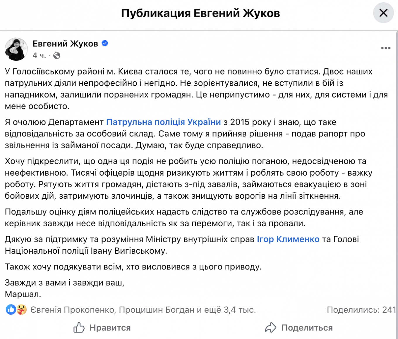 «Це неприпустимо — для них, для системи і для мене особисто. Я очолюю Департамент патрульної поліції України з 2015 року і знаю, що таке відповідальність за особовий склад. Саме тому я прийняв рішення — подав рапорт про звільнення із займаної посади. Думаю, так буде справедливо», — написав Жуков.