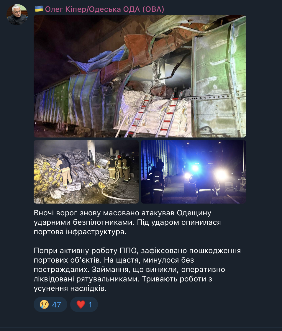 Як повідомляє голова Одеської обласної військової адміністрації Олег Кіпер, основний удар був спрямований на портову інфраструктуру області. Попри інтенсивну роботу підрозділів протиповітряної оборони, які збивали ворожі цілі, уникнути пошкоджень не вдалося.