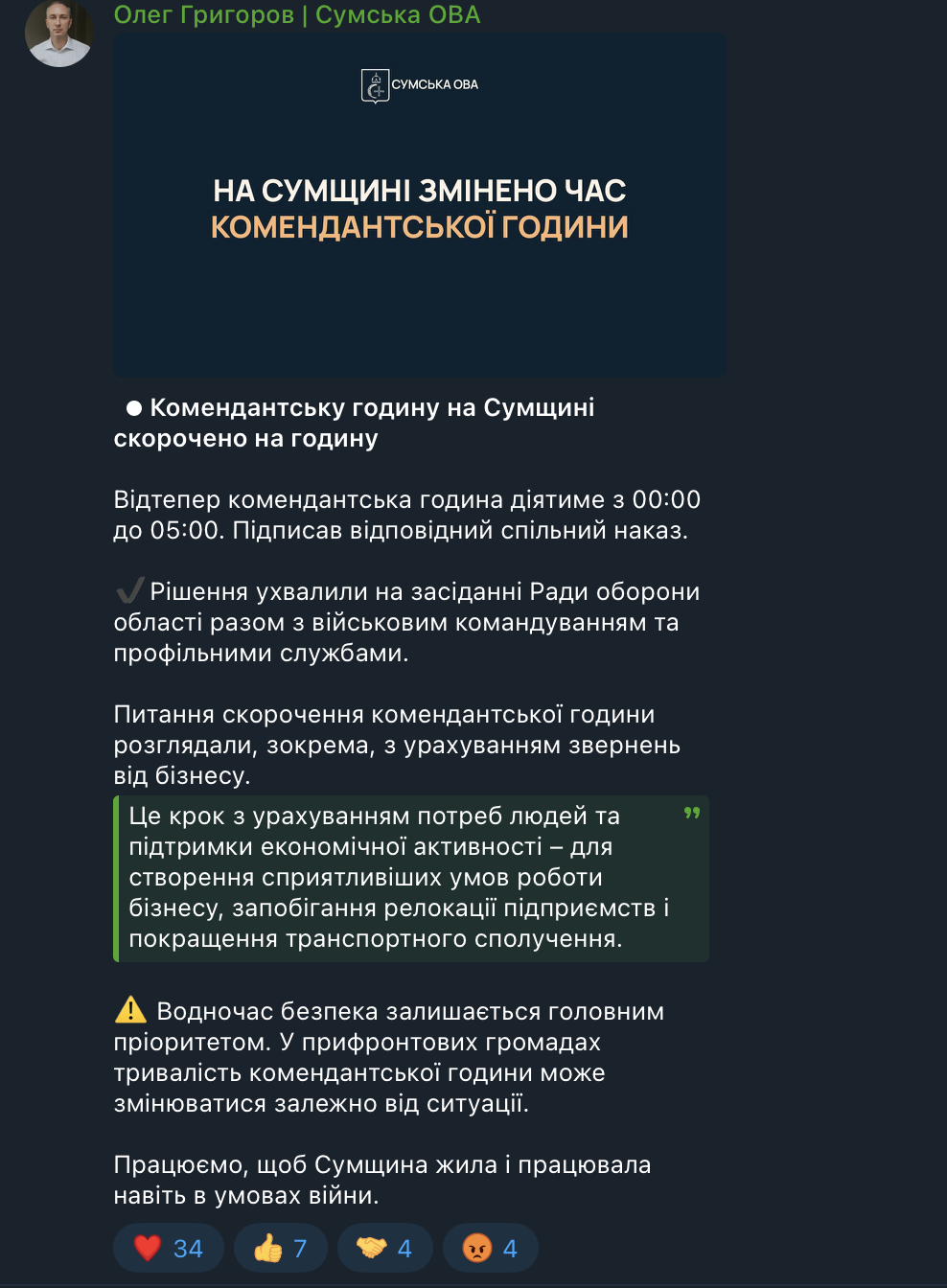 Згідно з наказом начальника Сумської обласної військової адміністрації Олега Григорова, комендантська година в області тепер діятиме з 00:00 до 05:00. Відповідне рішення було ухвалене Радою оборони області після консультацій із військовим командуванням та профільними службами.