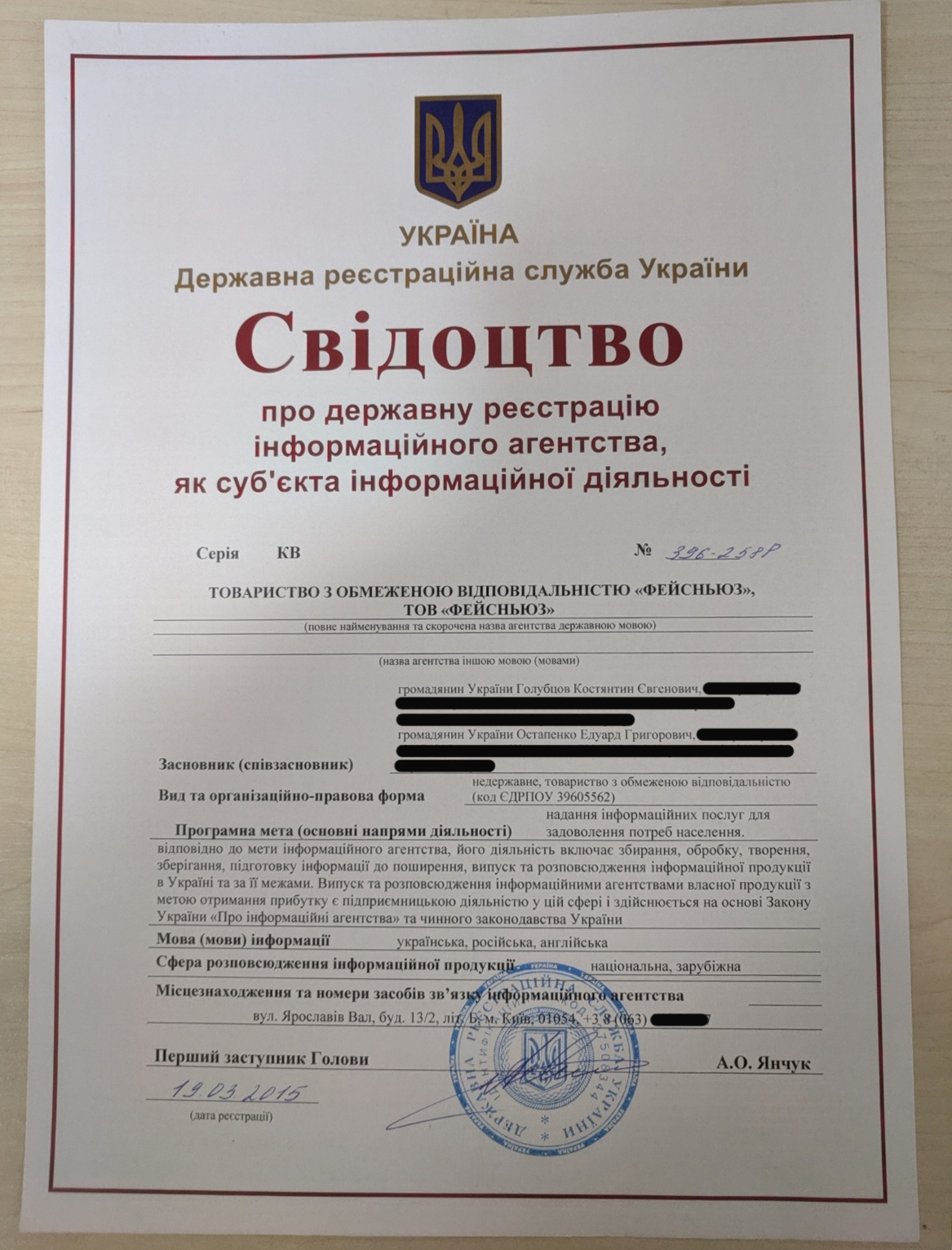 Управление новостным порталом https://www.facenews.ua/ (далее - «Сайт») осуществляется ТОВ «ФЕЙСНЬЮЗ», код ЕГРПОУ 39605562, юридическим лицом, зарегистрированным и действующим в соответствии с требованиями законодательства Украины