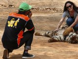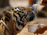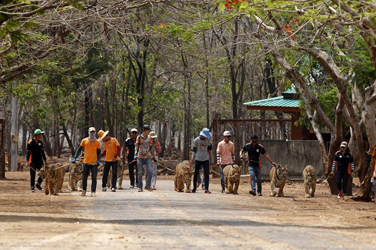 Тигров кормят вареной пищей, чтобы они не чувствовали вкуса крови, и сухим кошачьим кормом.