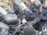 В полицию доставлены около 30 активных участников столкновений, в том числе стрелявший в правоохранителя. По сообщениям полиции, у них изъяты два устройства для отстрела резиновых пуль, две телескопические палки, граната, несколько ножей, газовые балончики и дымовые шашки.