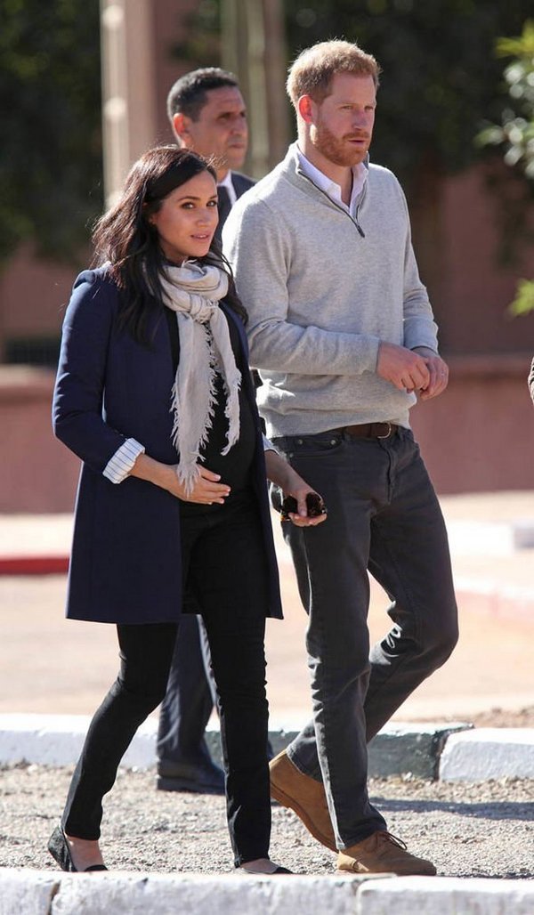 Герцогиня Сассекская, которая накануне блистала в аэропорту Касабланки в красном платье от Valentino и на шпильках, на этот раз оделась гораздо скромнее — в синее пальто-блейзер, черные облегающие джинсы, черный топ и черные балетки Birdies. Сверху был повязан серый шарф.