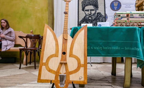 Гитара, гармошка, бандура, скрипка и другие инструменты сделаны из спичек мастером Богданом Сенчуковым (г.Жашков). А бас-гитара в виде трезубца (гербас) номинирована на рекорд Украины.