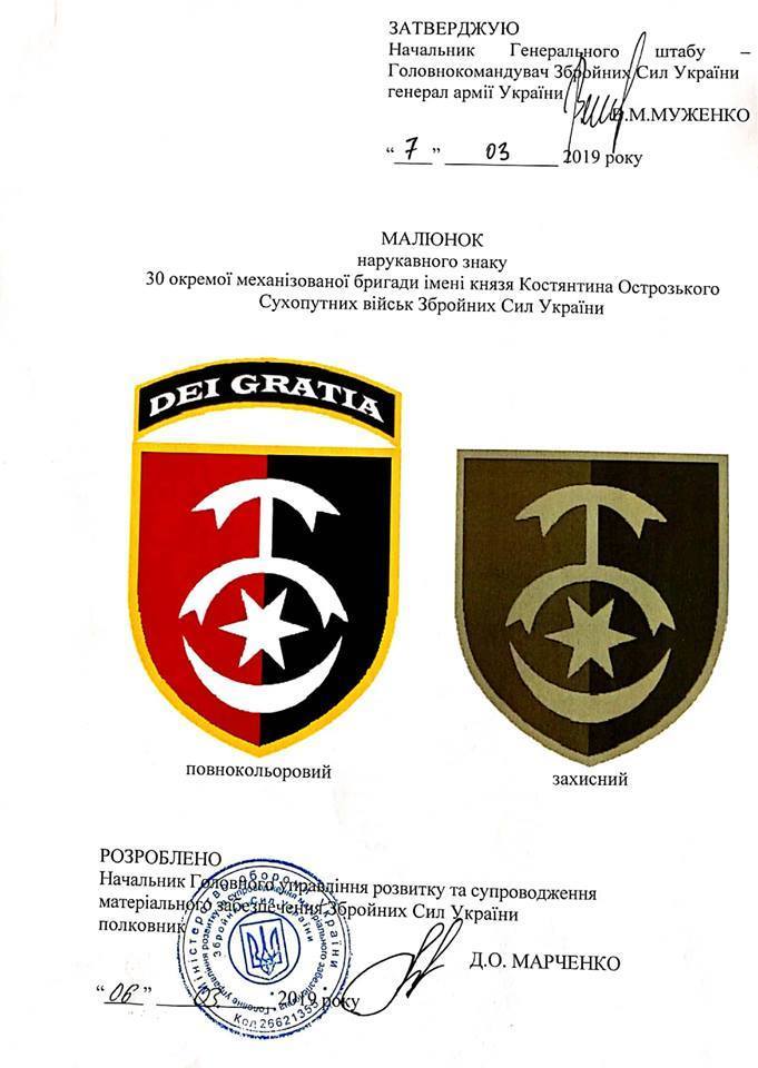 Как сообщил начальник Генштаба Виктор Муженко в Facebook, символику нового образца утвердили для 30-й отдельной механизированной бригады им. князя Константина Острожского, 58-й отдельной мотопехотной бригады им. гетмана Ивана Выговского и 72-й отдельной механизированной бригады им. Черных Запорожцев Сухопутных войск Вооруженных сил Украины.