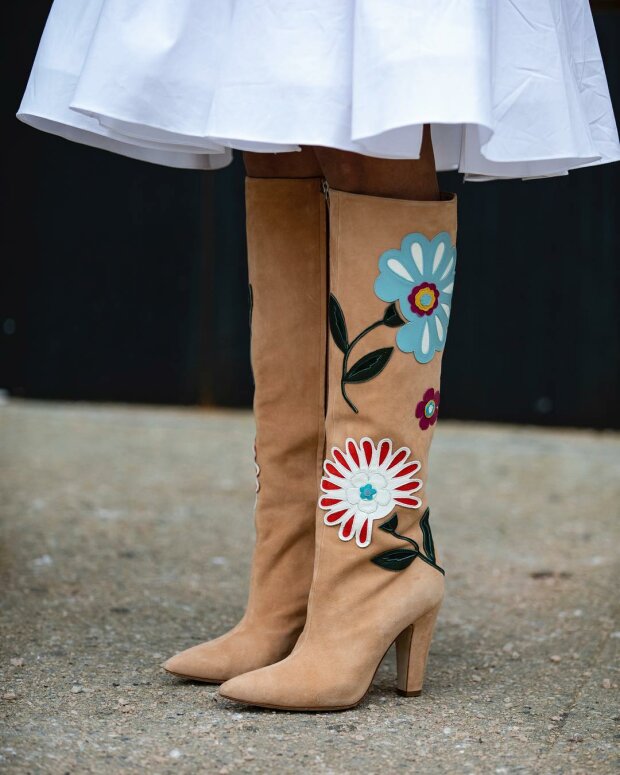 Что касается цветового решения, то здесь можно дать волю фантазии и выбирать абсолютно любые цвета: белые, черные, зеленые или лилового оттенка. Так же приветствуются сапоги с цветочными принтами.