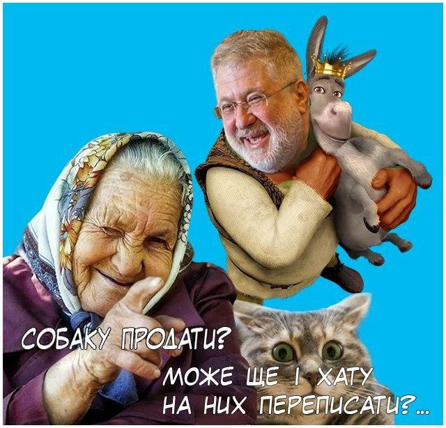Экс-владельца "Приватбанка" Коломойского изобразили вместе с небезызвестной "Бабой с котом", которая переспрашивает, а не переписать ли на собаку еще и хату.