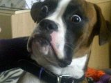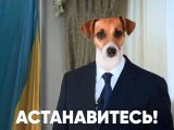 Сбежавший из Украины после Ревлолюции Достоинства президент Янукович изображен с головой собаки. Он говорит одну из самых известных своих фраз: "Останавитесь!"
