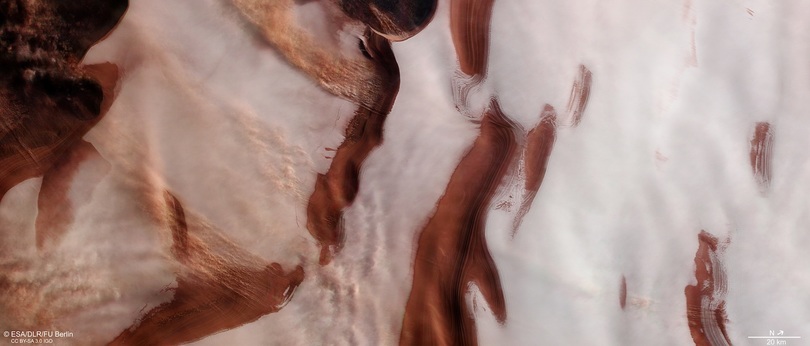 Земля - не единственная планета с морозным северным полюсом. На этом фото северного полюса Марса видно, что часть полярной ледяной шапки покрыта тёмно-красными впадинами и разрывами. Это свидетельствует о том, что в полярном районе дуют очень сильные ветры. Традиционный снег на Марсе не идет, но в атмосфере могут наблюдаться довольно плотные пылевые облака. Их также можно разглядеть на фоне снежной шапки. Снимок сделан орбитальным аппаратом Европейского космического агентства Mars Express.