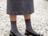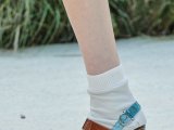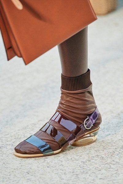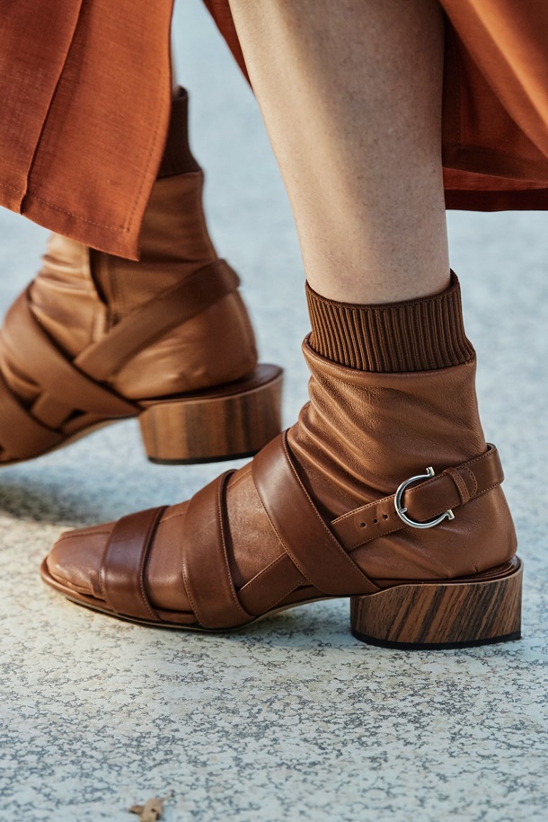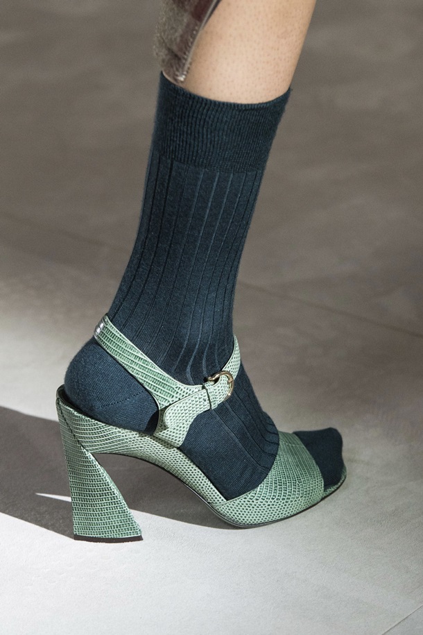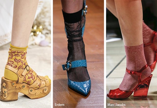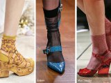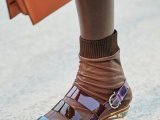 На показе Salvatore Ferragamо модели вышли на подиум в кожаных сандалиях и белых носках. В сандалиях на крупной деревянной платформе с носками разных цветов дефилировали манекенщицы на показе бренда A.P.C.