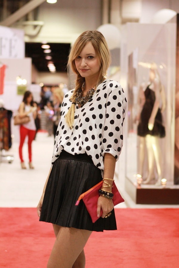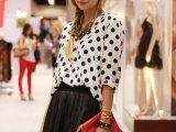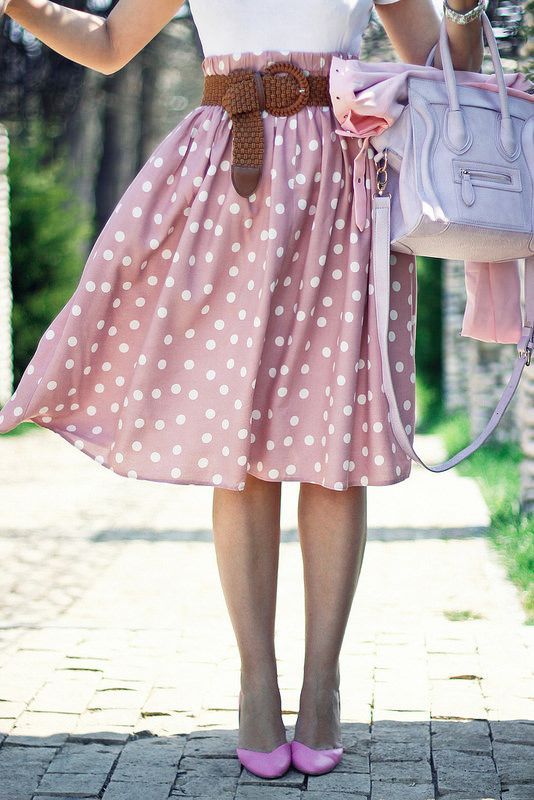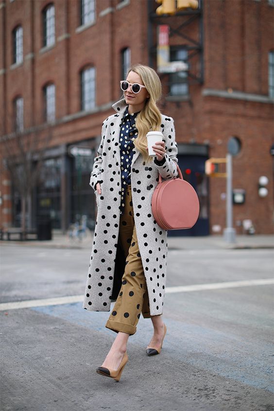 Для любительниц ярких образов хорошим вариантом может стать лук, в котором все элементы содержат узор в горошек. Такой наряд будет смотреться очень оригинально и необычно.